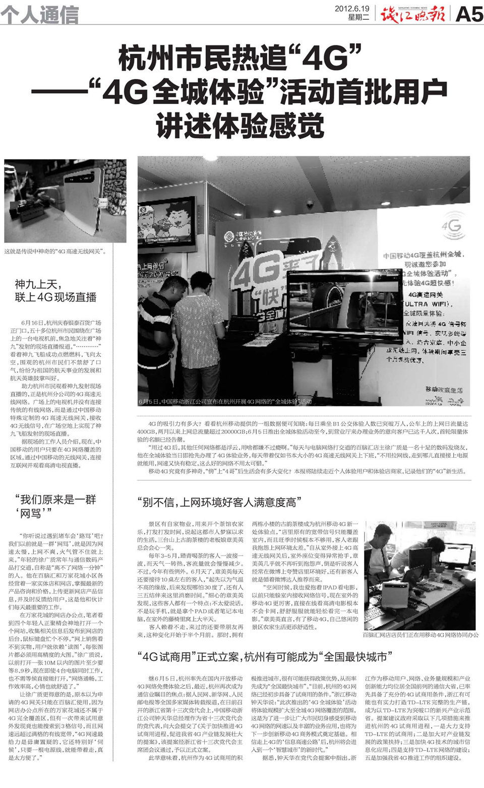 4G的吸引力有多大?看看杭州移动提供的一组数据便可知晓:每日乘坐B1公交体验人数已突破万人,公车上的上网日流量达400GB,两月以来上网总流量超过20000GB;6月5日推出全城体验活动至今,到营业厅来办理业务的意向客户已达千人次,首轮限量体验的名额已经告罄。