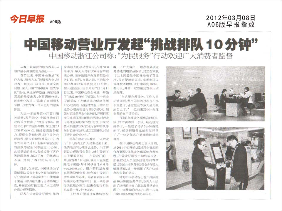 为进一步提升营业厅窗口服务质量,春节前夕,中国移动在行业内首次推出了“营业厅排队,挑战10分钟”的服务举措,在全国2.5万家营业网点,通过提高服务能力、提供业务预处理、简化业务办理流程、增设自助终端等方式,力争2012年2月1日起客户在营业厅的排队等候时间不超过10分钟。此项举措的推出,有效提升了客户等待满意度,解决了客户的焦虑与不满,受到了客户的认可与好评。