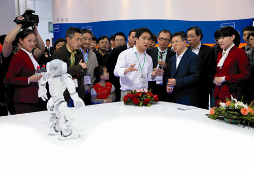4月19日,在杭州和平国际会展中心举行的第六届中国 杭州电子信息博览会上,中国移动杭州分公司展示了一名非常机灵的机器人,演示者只需用智能终端发出相应指令,该机器人就会唱歌、跳舞,还会打太极。